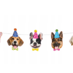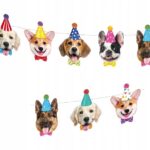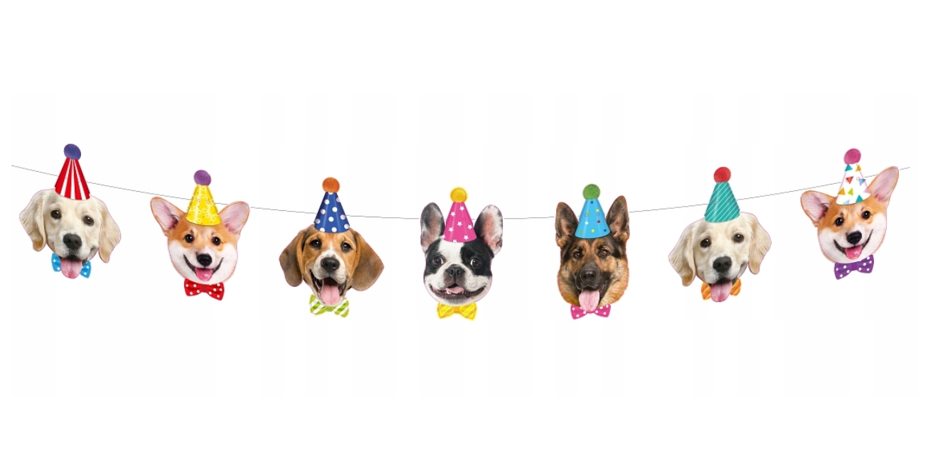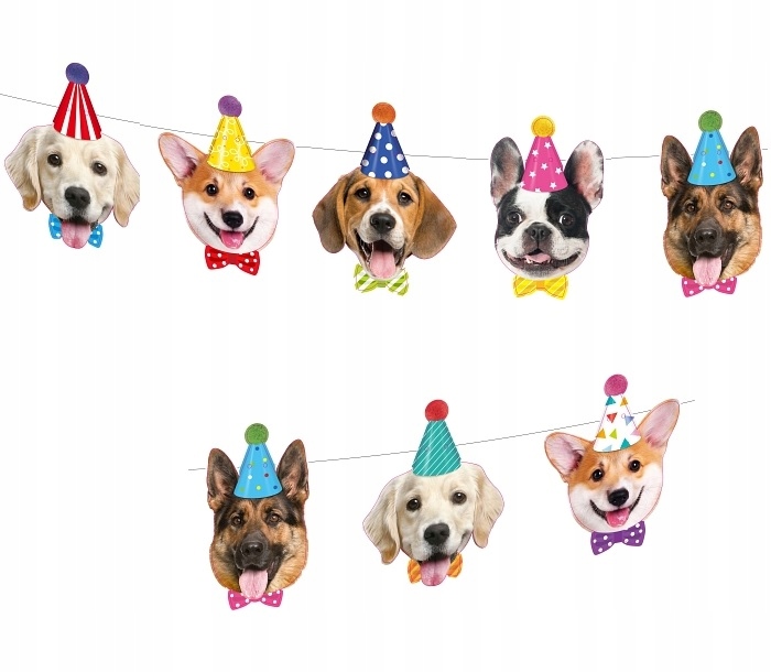 Farebná girlanda so psími motívmi v párty čiapkach, ideálna na narodeninové oslavy.